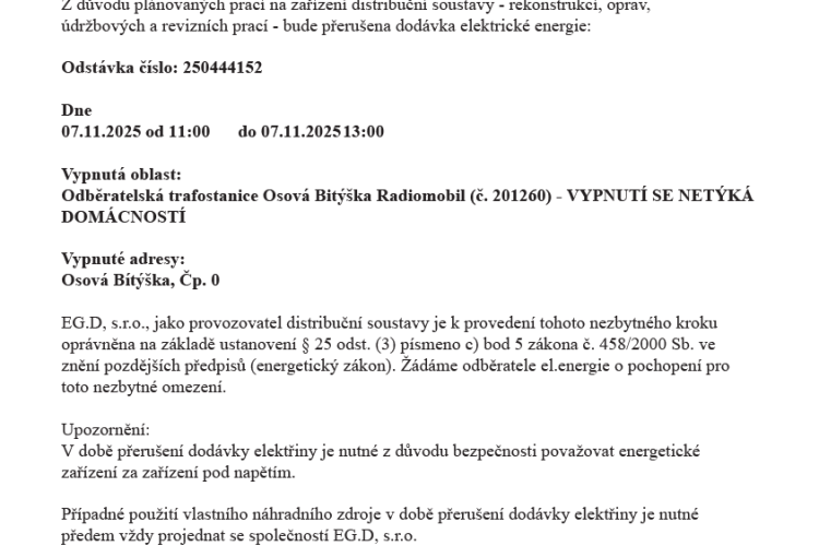 Oznámení o přerušení dodávky elektrické energie 11.11.2025