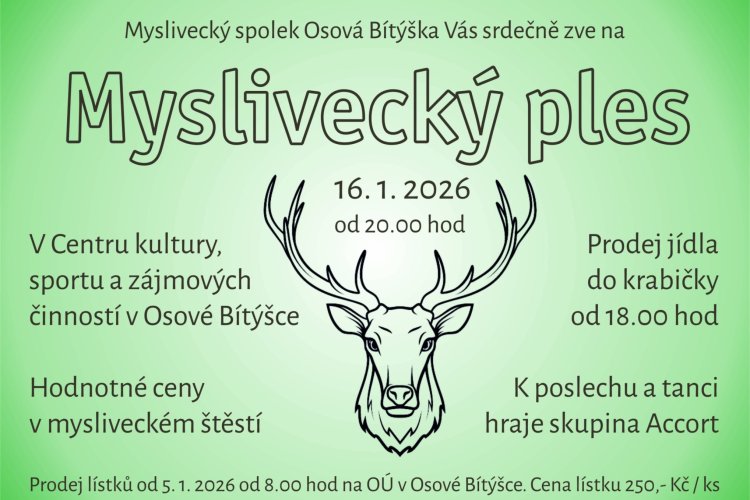 Myslivecký spolek Osová Bítýška Vás srdečně zve 16.01.2026 od 20:00 hod. do Centra kultury, sportu a zájmových činností na Myslivecký ples. Prodej…