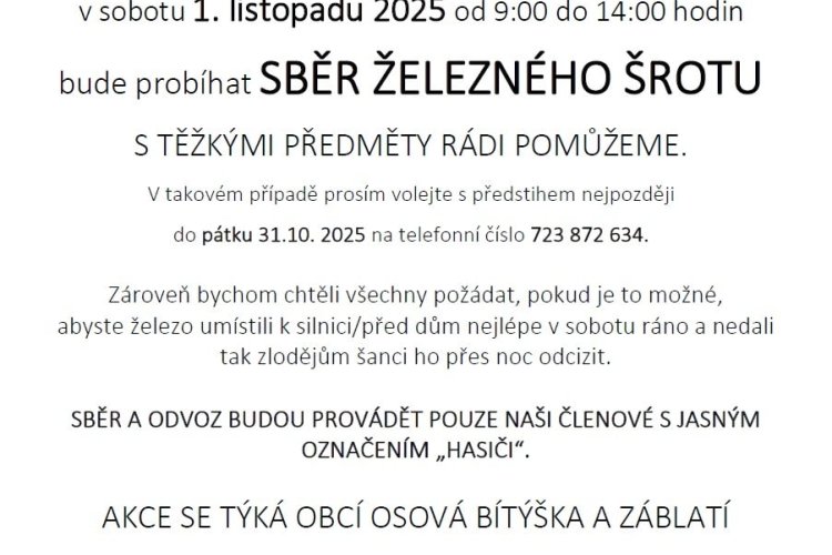 Sbor dobrovolných hasičů Osová Bítýška oznamuje, že v sobotu 01.11.2025 od 9:00 do 14:00 hod. bude probíhat sběr železného šrotu. S těžkými…
