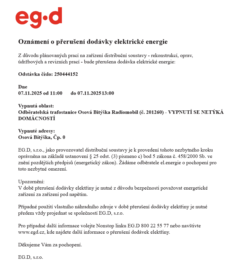 Oznámení o přerušení dodávky elektrické energie 07.11.2025