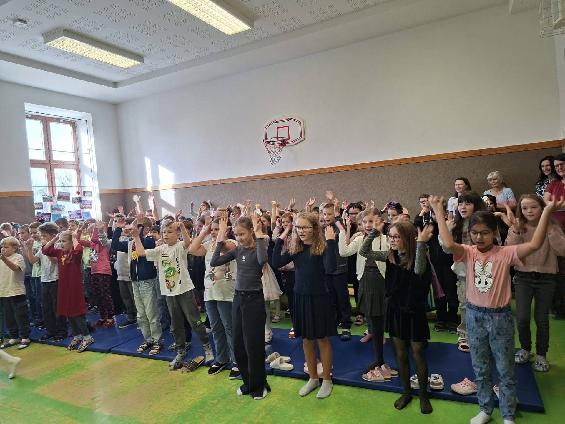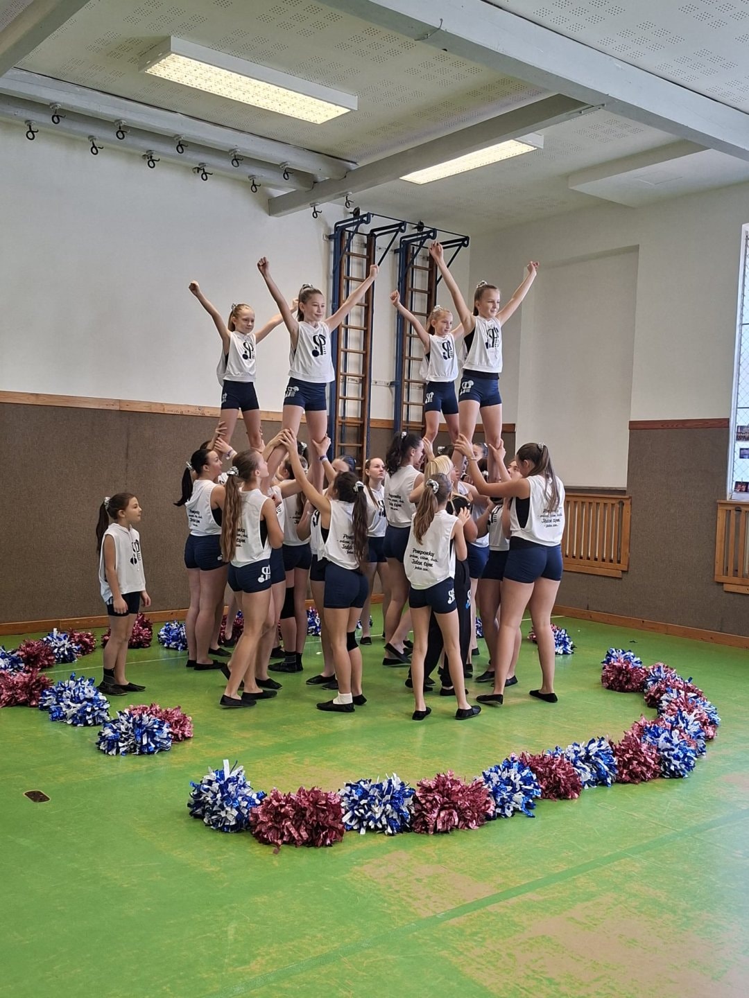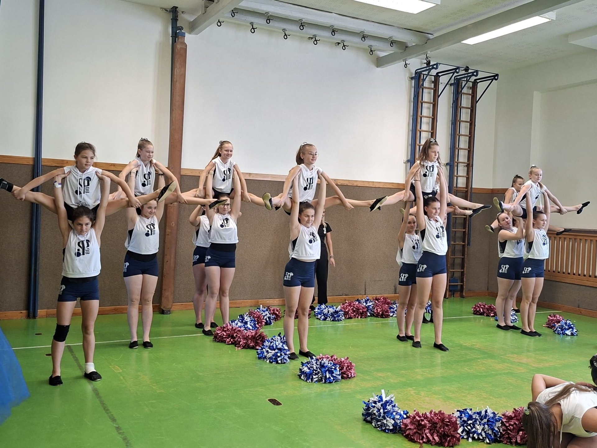 Během půlhodinového vystoupení, které probíhalo ve čtyřech blocích pro jednotlivé třídy, se naše děvčata nejprve krátce představila a poté předvedla upravenou část své soutěžní sestavy. Následovala společná taneční chvilka s dětmi na oblíbenou písničku „Hlava, ramena, kolena, palce“, která roztančila celou tělocvičnu. Po pořádném protažení přišla na řadu ukázka gymnastických prvků a zvedaček, které všechny přítomné nadchly. Na závěr si mohli dobrovolníci z řad žáků sami vyzkoušet, jaké to je být součástí zvedačky – a s nadšením se zapojili!