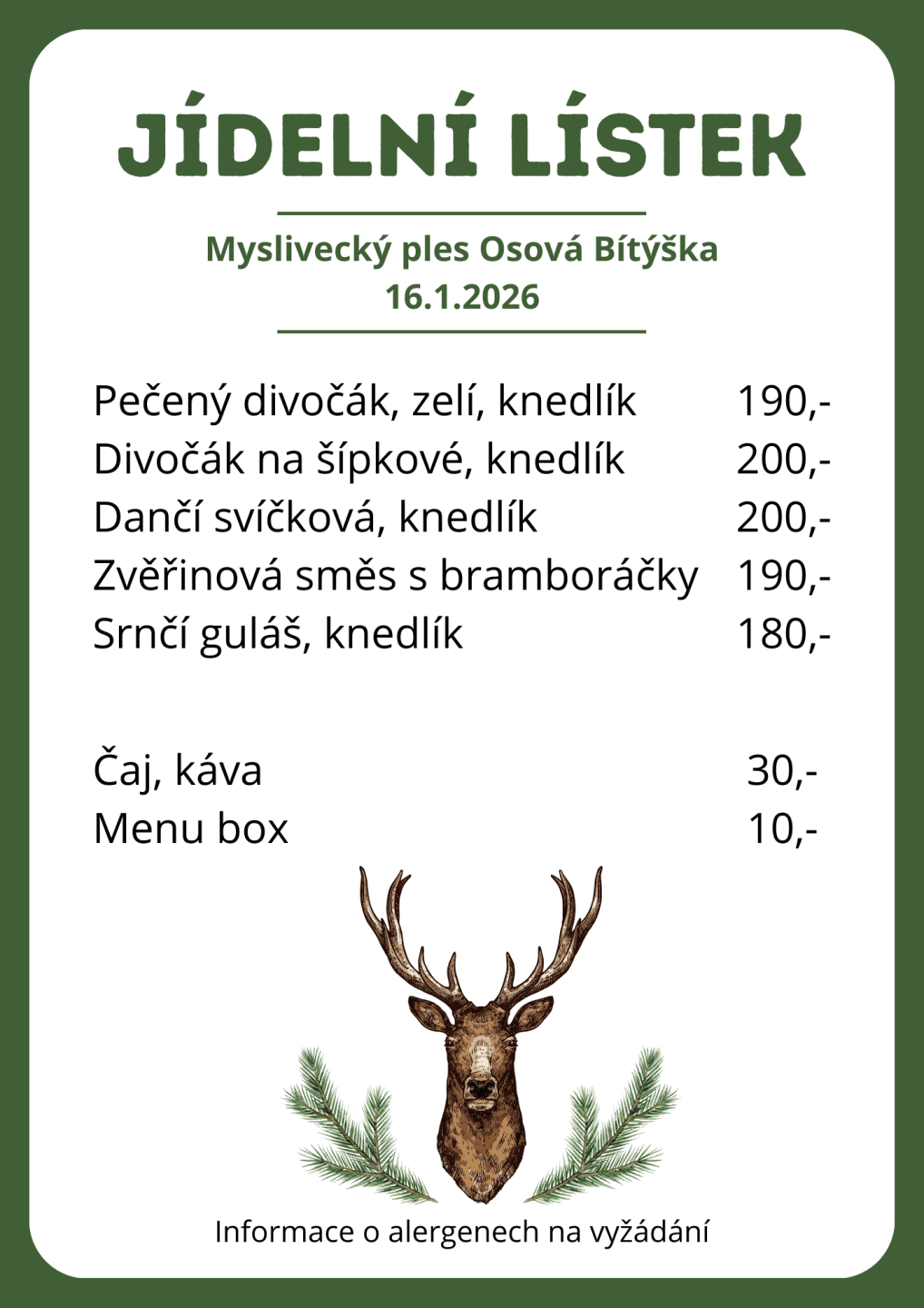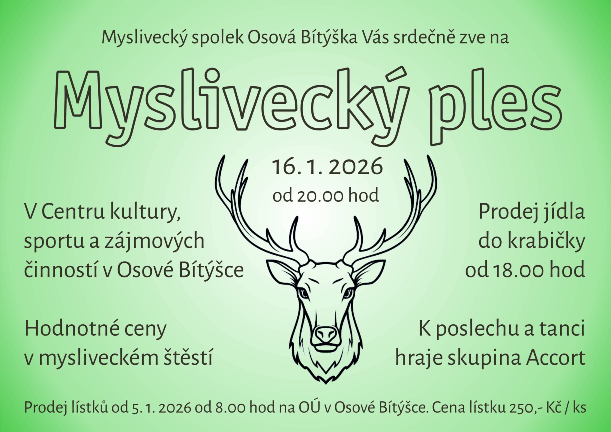 Myslivecký spolek Osová Bítýška Vás srdečně zve 16.01.2026 od 20:00 hod. do Centra kultury, sportu a zájmových činností na Myslivecký ples.