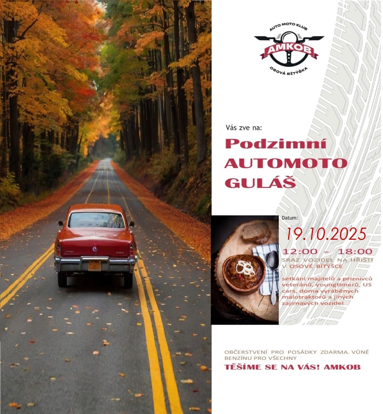 Auto moto klub Osová Bítýška Vás zve v neděli 19.10.2025 od 12:00 do 18:00 hod. na Podzimní auto moto guláš.