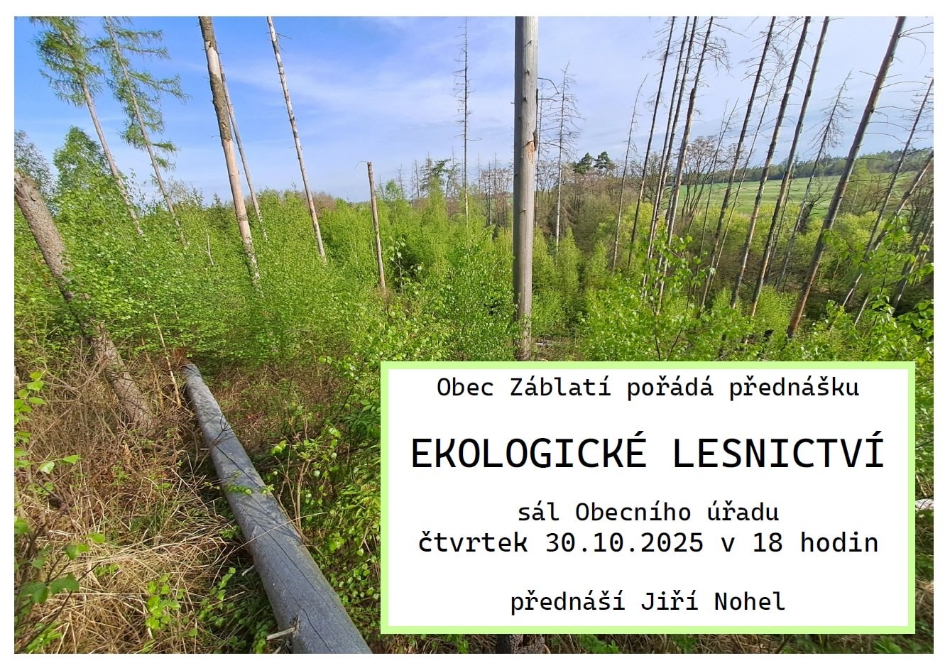 Obec Záblatí pořádá ve čtvrtek 30.10.2025 v 18:00 hod. v sále Obecního úřadu Záblatí přednášku s názvem Ekologické lesnictví.