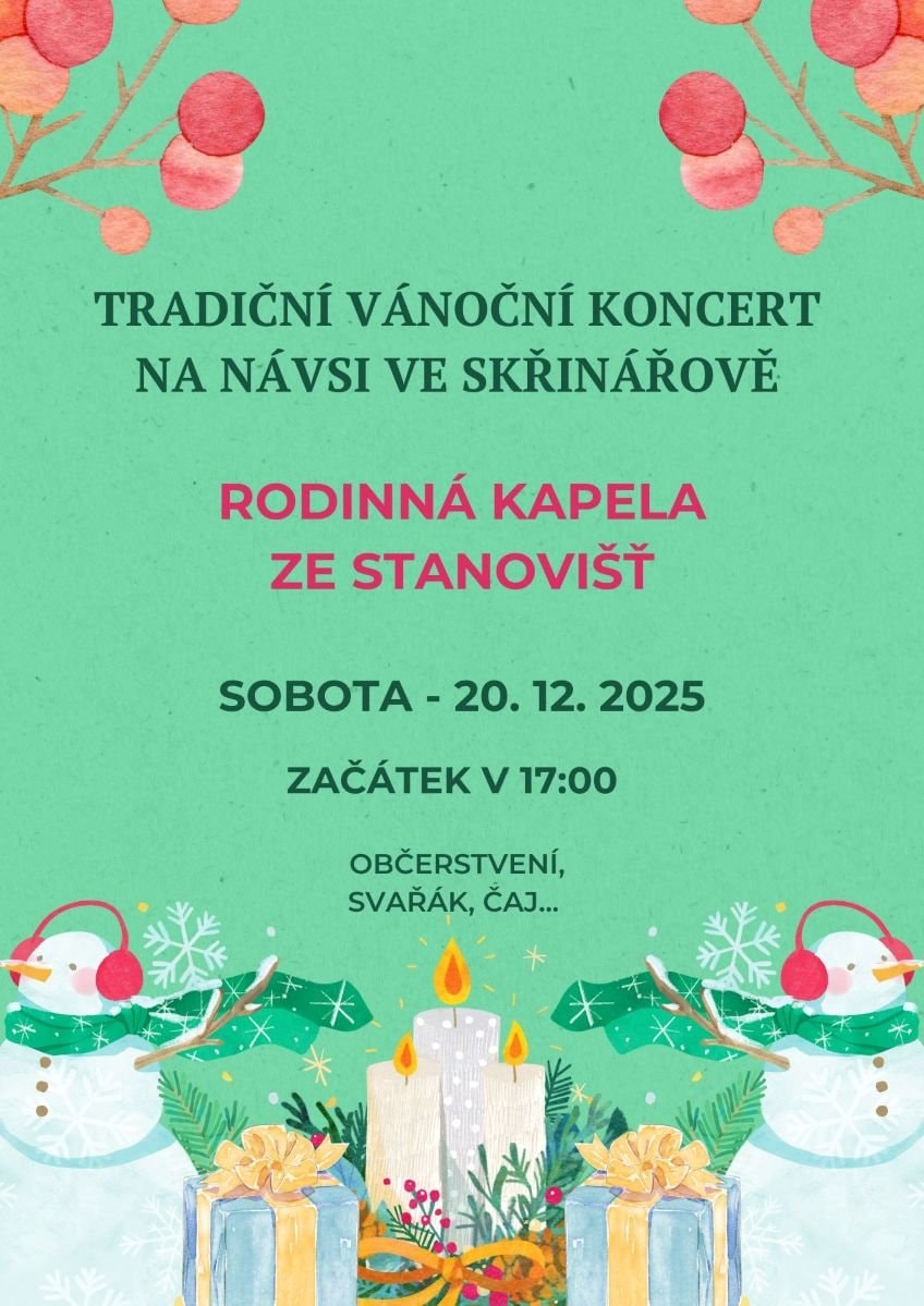 Obec Skřinářov Vás zve v sobotu 20.12.2025 od 17:00 hod. na náves ve Skřinářově na tradiční vánoční koncert.