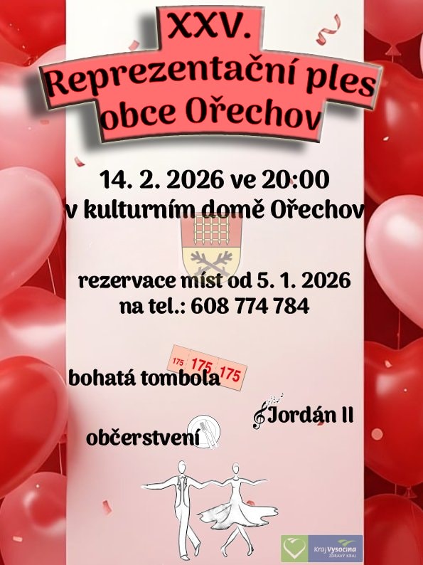 Obec Ořechov Vás zve 14.02.2026 do kulturního domu v Ořechově na XXV. reprezentační ples obce Ořechov.