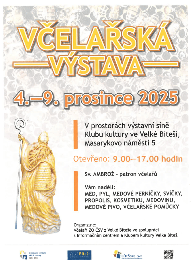 Včelaři ZO ČSV z Velké Bíteše ve spolupráci s Informačním centrem a Klubem kultury Velké Bíteše Vás zvou v termínu od 04.12.2024 do 09.12.2025 na včelařskou výstavu.