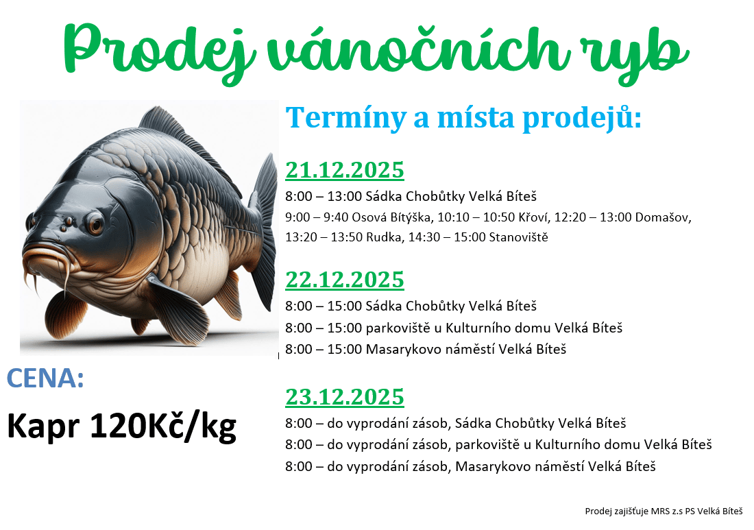 V neděli 21.12.2025 od 09:00 do 09:40 hod. bude Rybářský svaz Velká Bíteš prodávat před obecním úřadem kapry, cena 120 Kč/kg.
