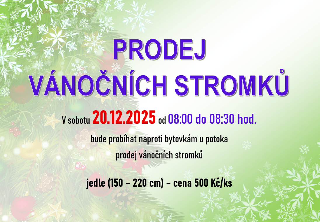 V sobotu 20.12.2025 od 08:00 do 08:30 hod. bude probíhat naproti bytovkám u potoka prodej vánočních stromků jedle (150 – 220 cm) – cena 500 Kč/ks.
