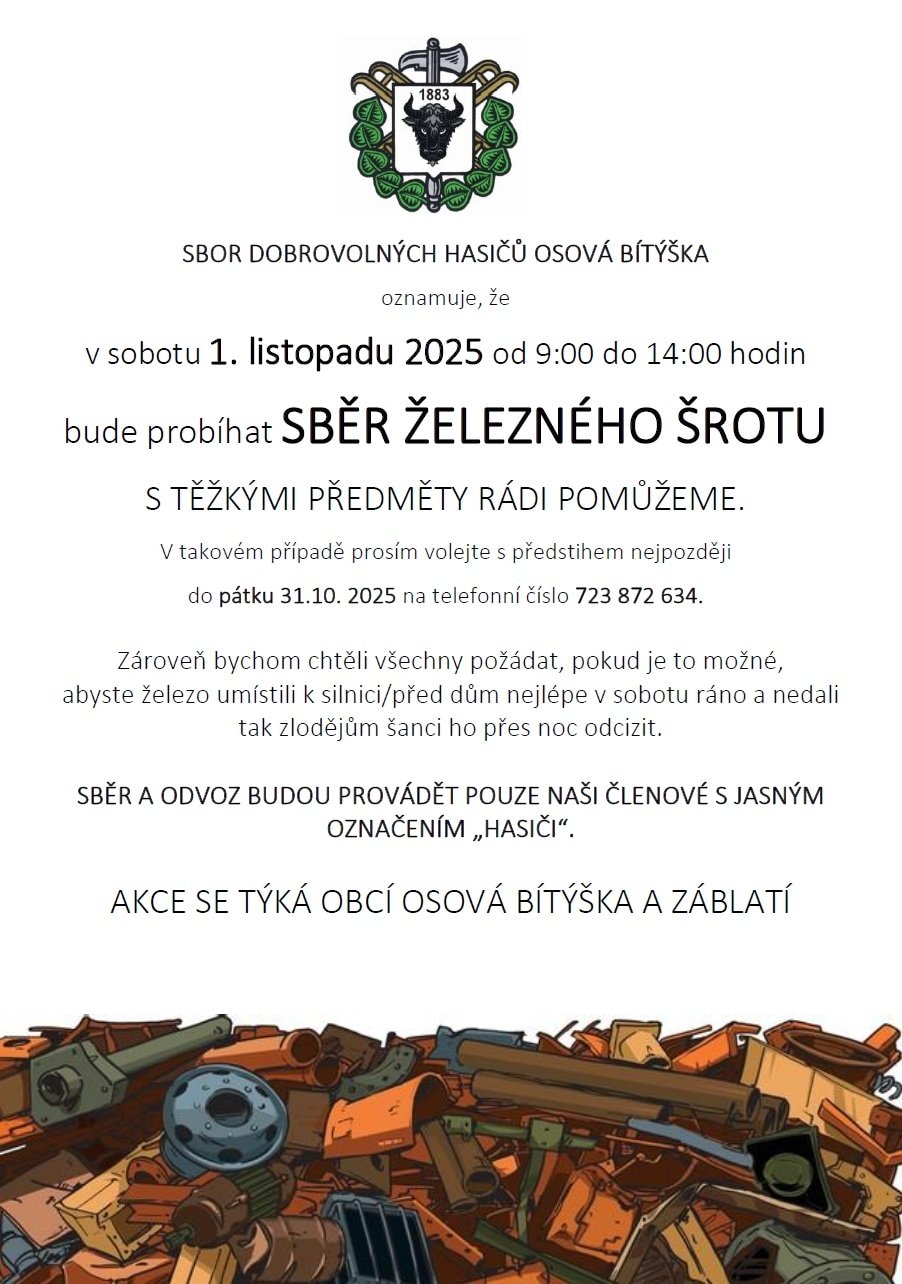 Sbor dobrovolných hasičů Osová Bítýška oznamuje, že v sobotu 01.11.2025 od 9:00 do 14:00 hod. bude probíhat sběr železného šrotu.