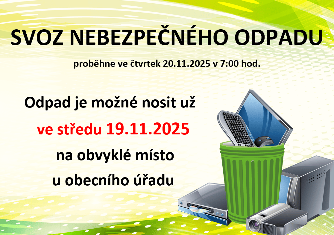 Svoz nebezpečného odpadu proběhne ve čtvrtek 20.11.2025 v 7:00 hod. Odpad je možné nosit už ve středu 19.11.2025 na obvyklé místo u obecního úřadu.