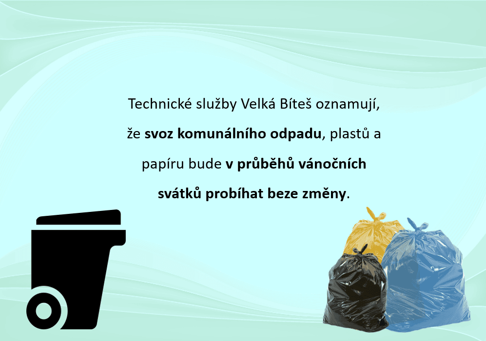 Technické služby Velká Bíteš oznamují, že svoz komunálního odpadu, plastů a papíru bude v průběhů vánočních svátků probíhat beze změny.