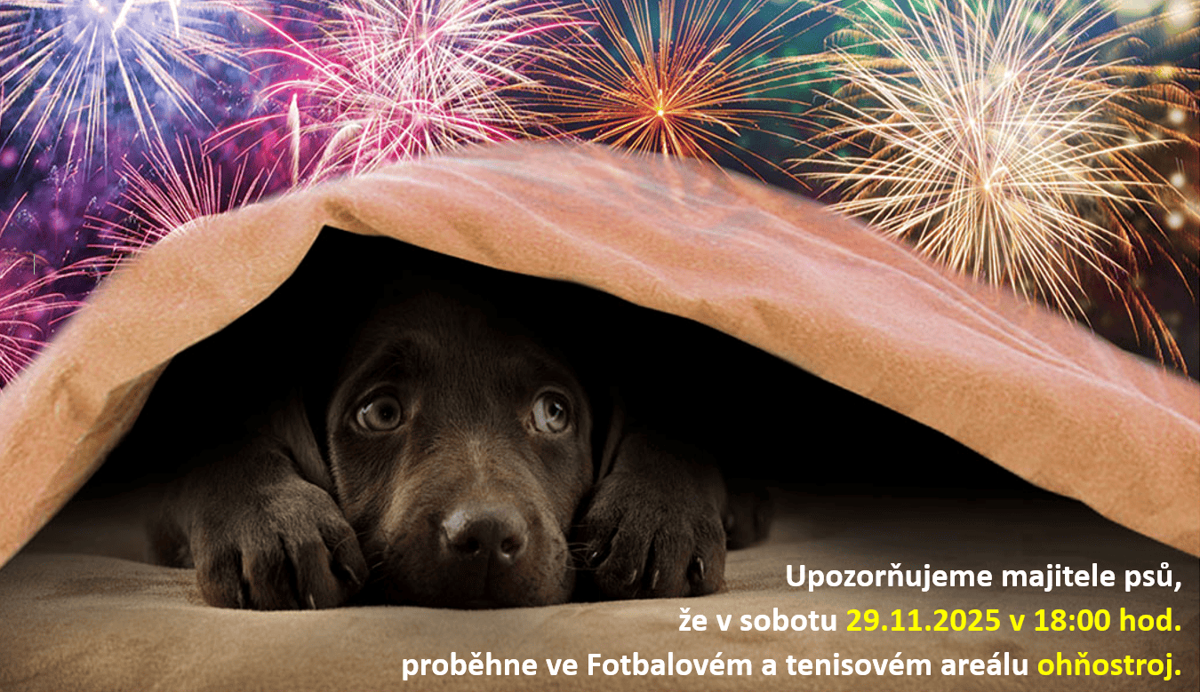 Upozorňujeme majitele psů, že v sobotu 29.11.2025 v 18:00 hod. proběhne ve Fotbalovém a tenisovém areálu ohňostroj.