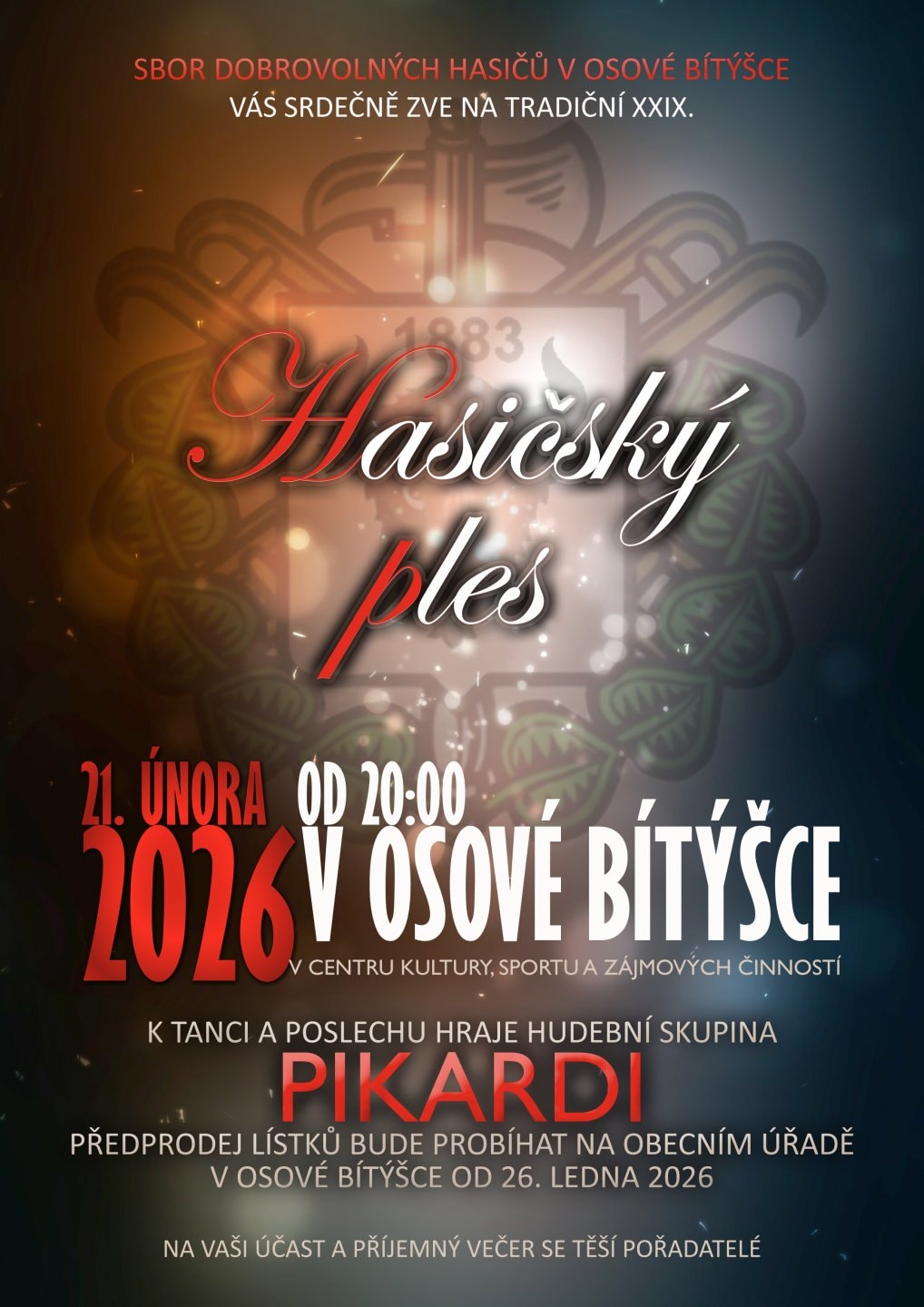 Sbor dobrovolných hasičů v Osové Bítýšce Vás zve v sobotu 21.02.2026 do Centra kultury, sportu a zájmových činnosti na XXIX. Hasičský ples. K tanci a poslechu zahraje skupina Pikardi.