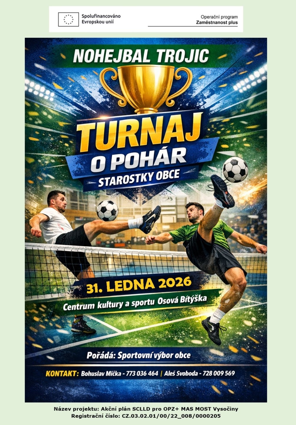 Sportovní výbor obce Vás zve v sobotu 31.01.2026 do Centra kultury, sportu a zájmových činností na nohejbalový turnaj o pohár starostky obce. Prezence v 8:45 hod., začátek v 9:00 hod. Přihlášky týmů přijímá pan Bohuslav Mička 773 036 464 nebo pan Aleš Svoboda 728 009 569.