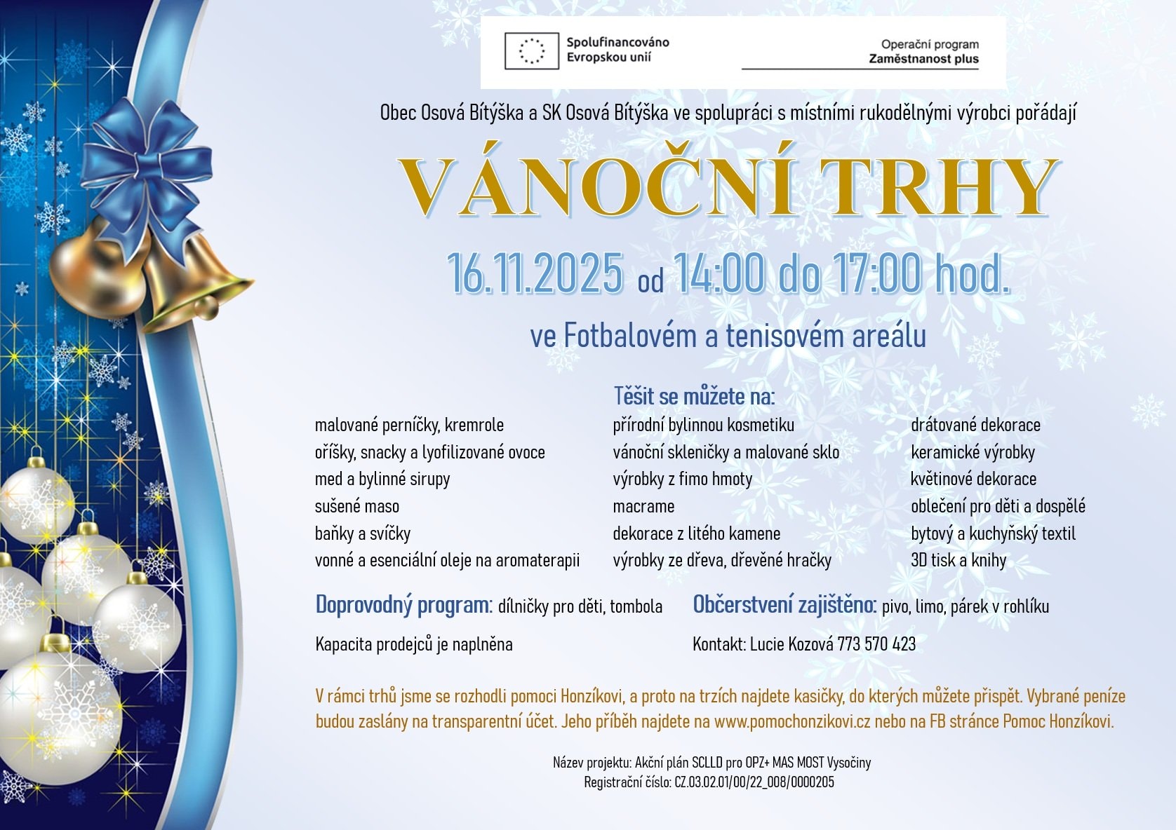 Obec Osová Bítýška a SK Osová Bítýška ve spolupráci s místními rukodělnými výrobci Vás zvou v neděli 16.11.2025 od 14:00 do 17:00 hod. do Fotbalového a tenisového areálu na Vánoční trhy.